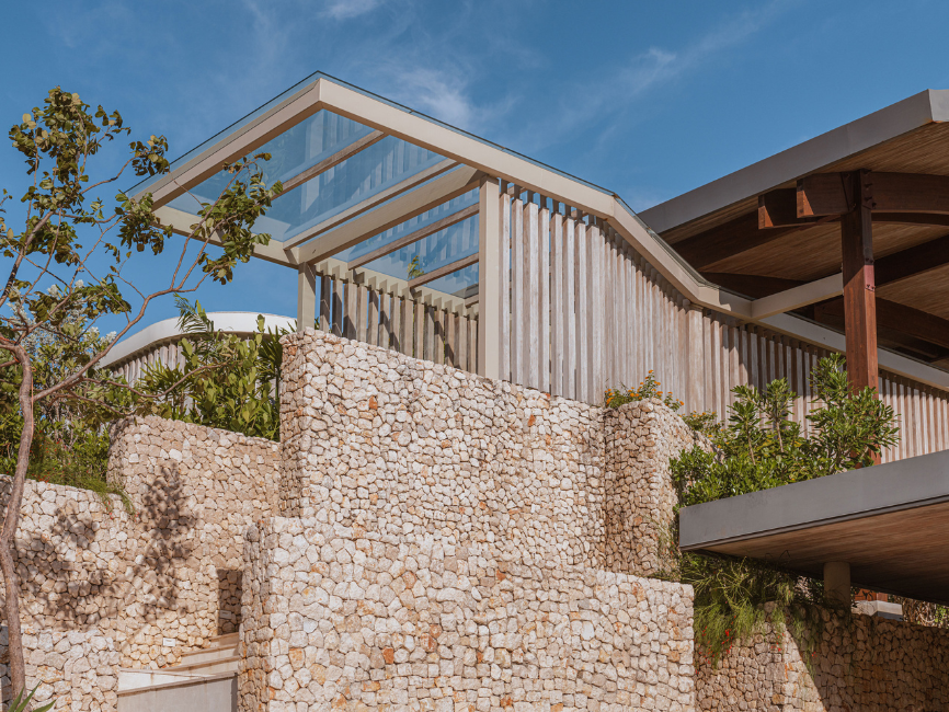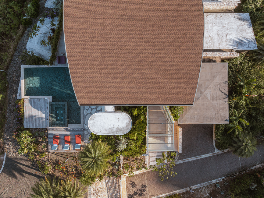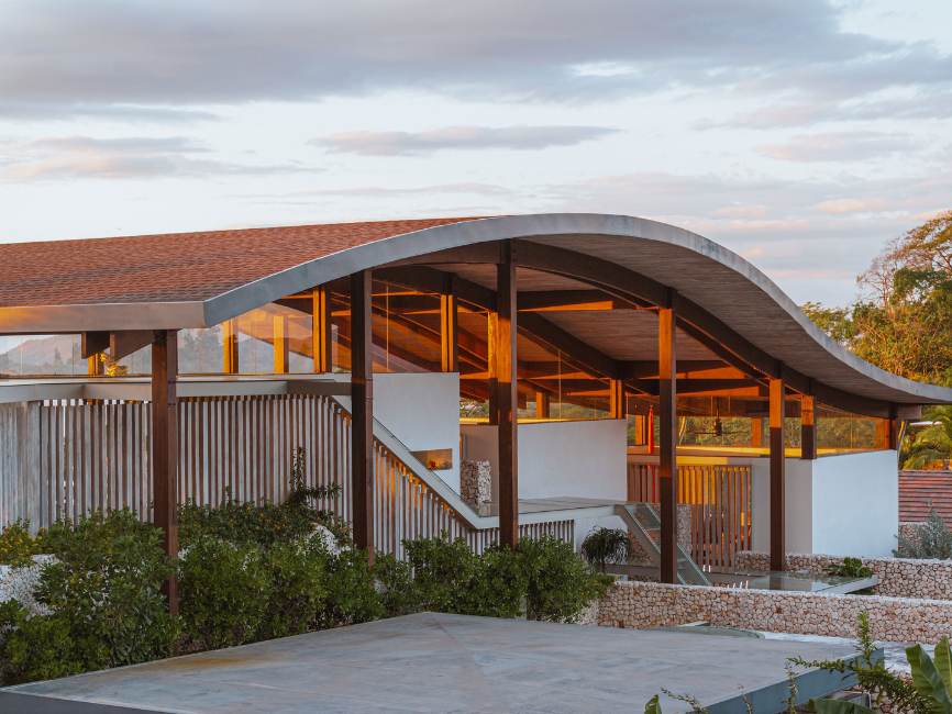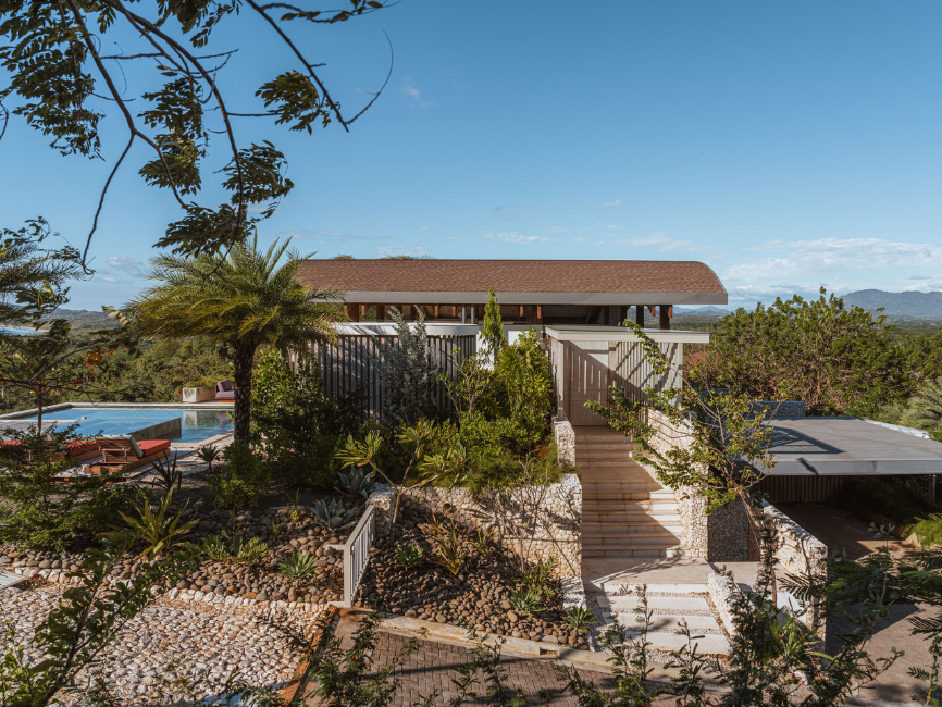 La Villa Áurea se ubica en una colina de Tamarindo, Costa Rica, y desde el inicio su diseño se planteó como un reflejo del terreno inclinado: “se aprovecha la pendiente para generar una simbiosis entre la tierra y el cielo”.