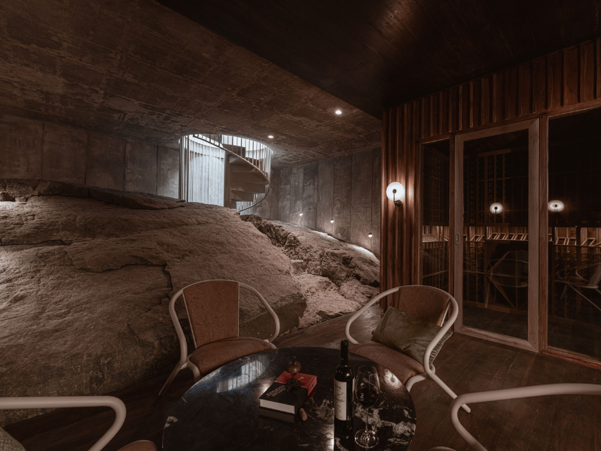 La cimentación aprovecha la roca firme del lugar, evitando excavaciones profundas, y se optó por un sistema estructural con pilares y vigas de madera pretensada que permiten una fijación mínima al terreno, preservando su integridad. Un descubrimiento fortuito de roca maciza se transformó finalmente en la bodega del proyecto, como símbolo de conexión con lo natural.