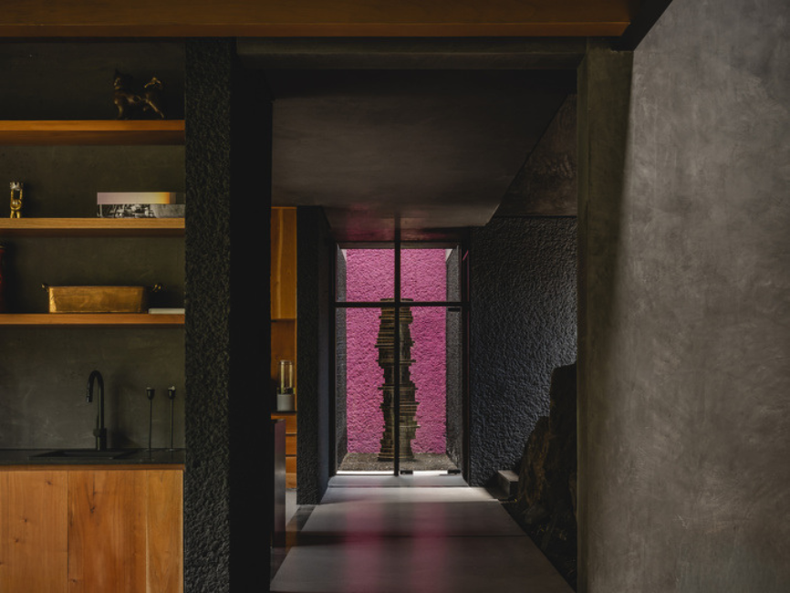 La vivienda se define a partir de una paleta mineral y sobria compuesta por concreto, estuco oscuro, madera y gravilla volcánica, que aportan textura y profundidad. Sobre esta base, acentos en tonos vibrantes y elementos como vidrios coloreados introducen matices lumínicos que transforman la percepción del espacio a lo largo del día.