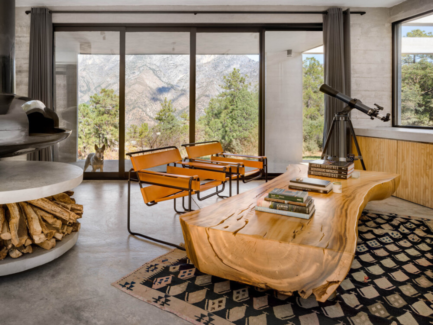 Se utilizaron materiales como concreto expuesto (con encofrado horizontal), metal y grandes ventanales con marcos de aluminio. El exterior cuenta con un mirador, una fogata y una mesa grande para 20 personas, todos hechos de monolitos de concreto.