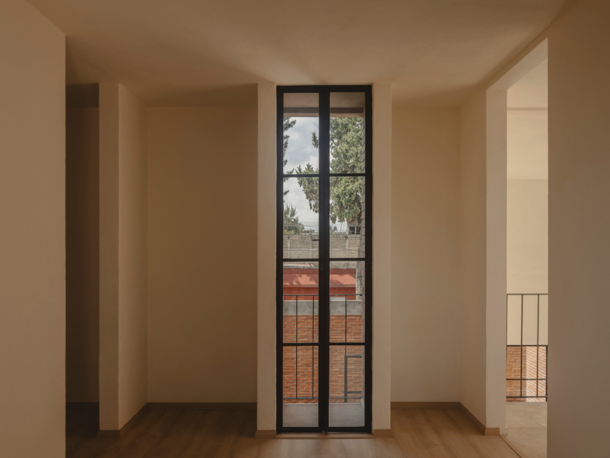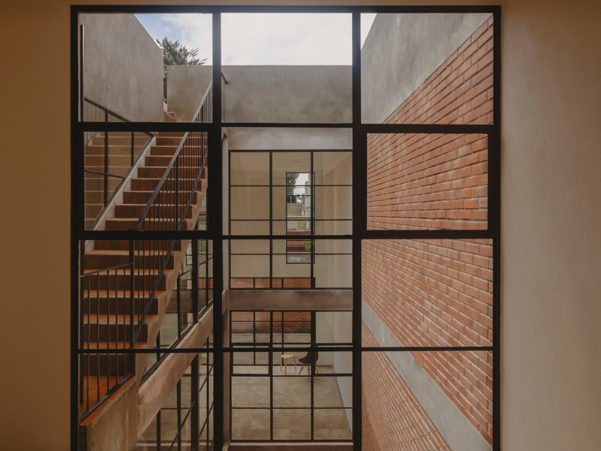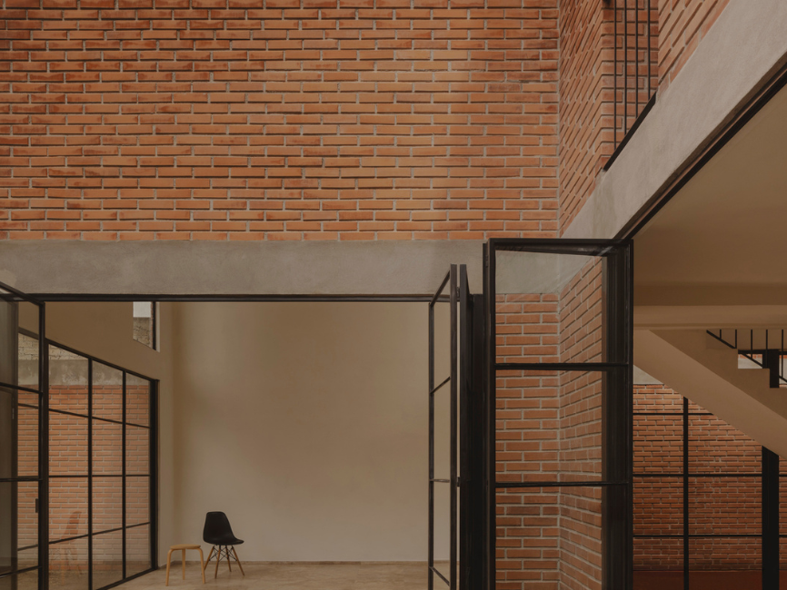 En términos materiales, el uso del tabique aparente redefine la estética predominante del lugar, dominada por el block de concreto expuesto. Esta elección no busca diferenciarse de manera radical, sino reinterpretar los códigos constructivos existentes a través de una paleta cromática y una textura que aportan calidez y carácter al conjunto.