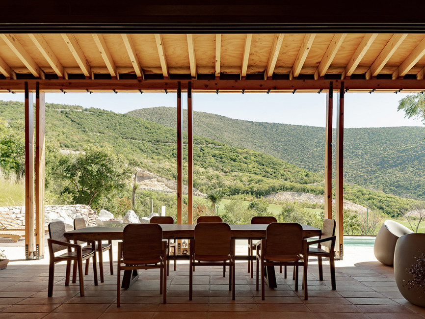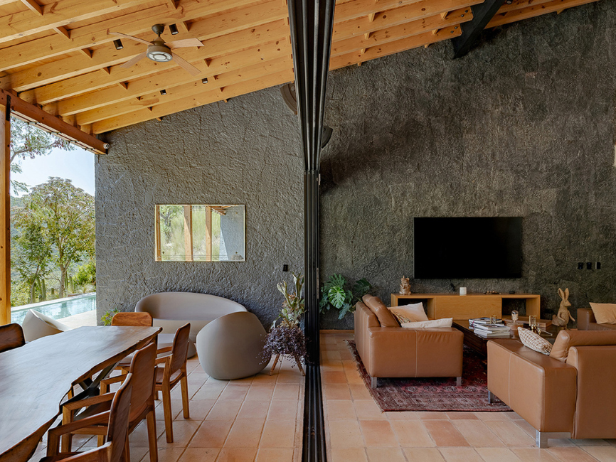 Los muros de piedra emergen directamente del suelo, actuando como elementos estructurales y protagonistas tanto en los interiores como en las fachadas. La cubierta inclinada de madera enmarca las vistas hacia el campo de golf, reforzando la sensación de apertura y conexión visual con la naturaleza. Al interior, los pisos de barro aportan textura y carácter, mientras que los muros de sillar crean una sensación térrea que fortalece el vínculo con el contexto natural.