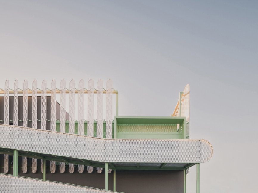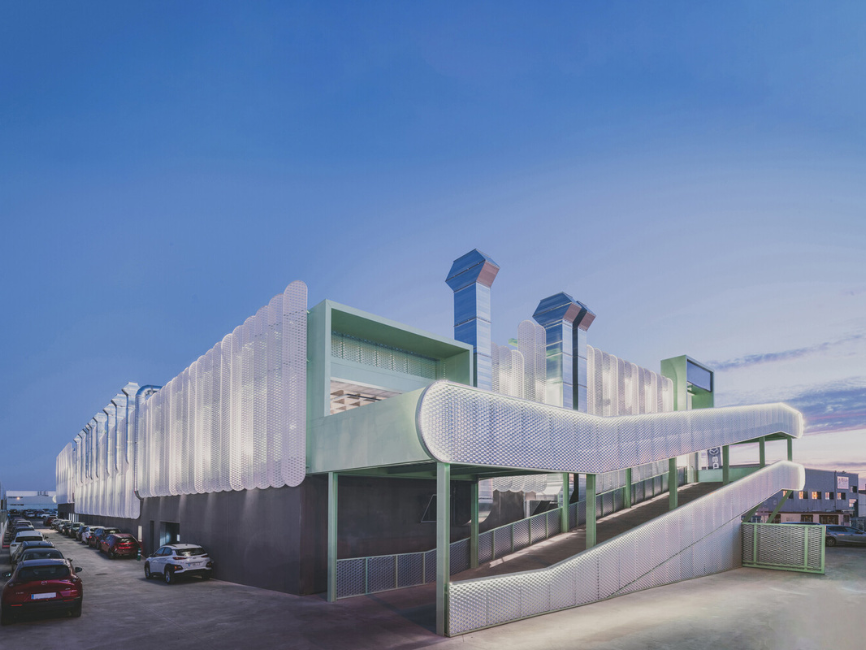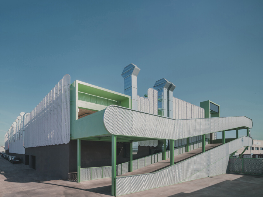 El edificio incorpora estrategias como ventilación natural, control solar pasivo y generación de energía mediante pérgolas fotovoltaicas, reduciendo su impacto ambiental. Más allá de su función, el proyecto plantea una nueva forma de entender la arquitectura industrial, donde eficiencia, sostenibilidad y expresión formal se integran en una propuesta coherente.