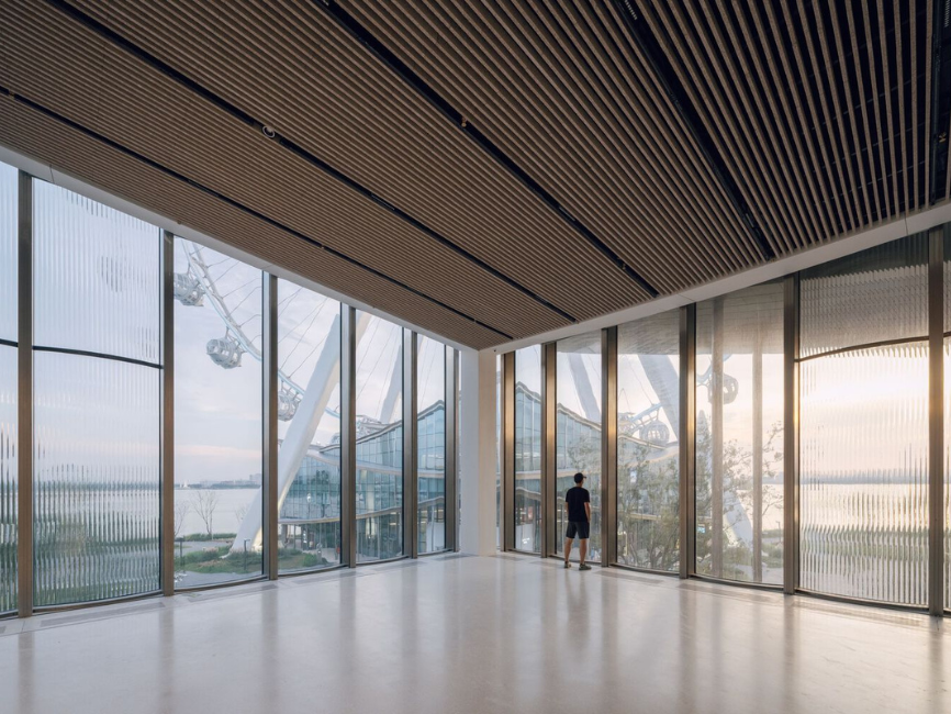 Vidrio curvo, acero inoxidable cálido y transparencias estratégicas permiten que el edificio refleje el cielo y el lago, integrándose visualmente con el entorno. Cada superficie está pensada para capturar luz y movimiento, otorgando dinamismo a la experiencia arquitectónica.