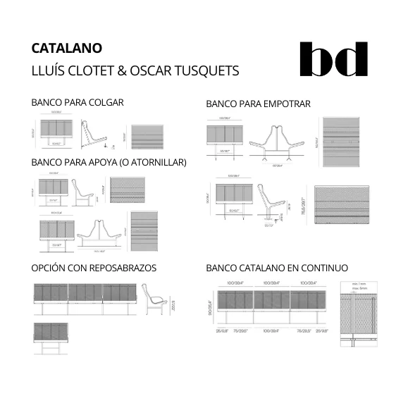 Banco modelo CATALANO de diseño original, es un asiento formado por un chasis en tubo de acero recubierto con chapa de acero deployé, patas para colgar, empotrar o apoyar de tubo de acero, se puede usar doble empotrando las espaldas de los bancos.