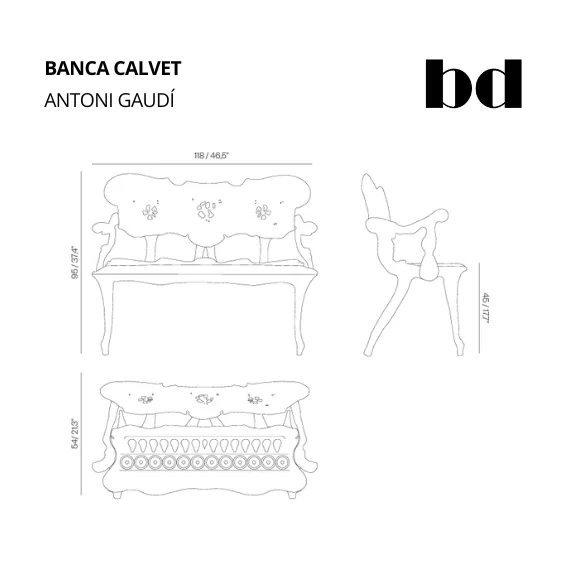 Banca original modelo CALVET, pieza de madera de roble maciza simétrica que consta de un asiento, respaldo, estructura inferior formada por seis patas y un apoyabrazos en cada extremo, asiento para dos personas.