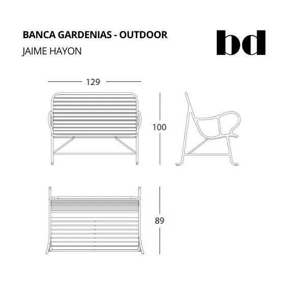Banca modelo GARDENIAS - OUTDOOR, estructura elaborada en fundición y extrusión de aluminio, en colores blanco, verde o gris, tapicería desmontable, desfundable y con tejido impermeable y transpirable.