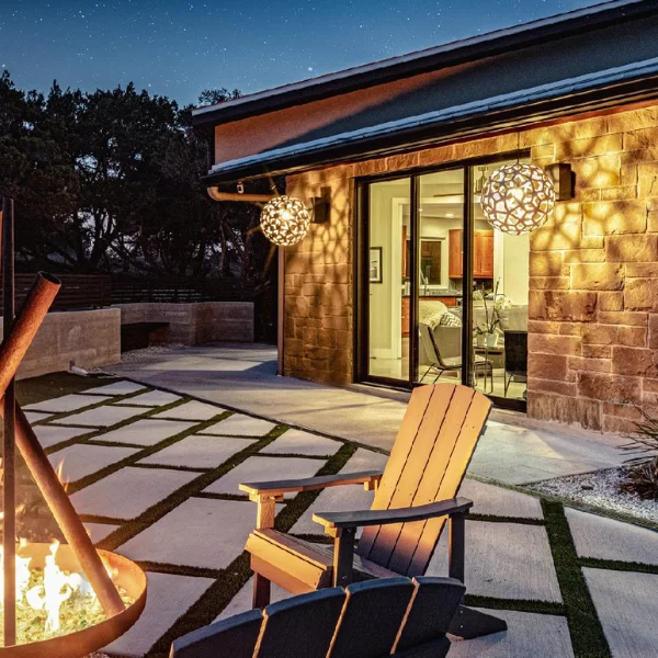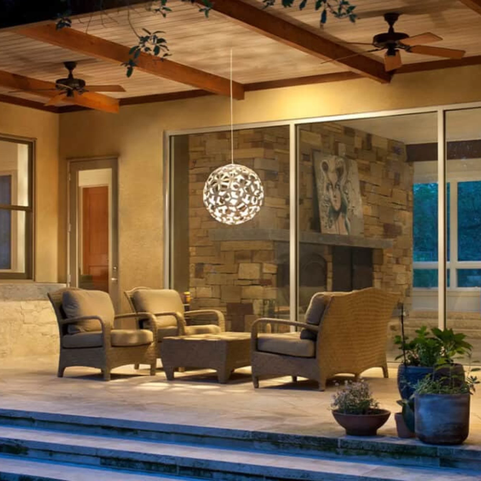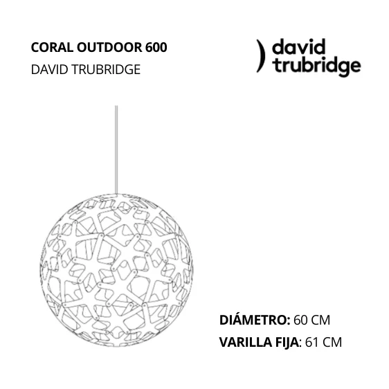 La lámpara colgante CORAL OUTDOOR 600 para exteriores es la más reciente incorporación a la colección de iluminación de David Trubridge, una pieza icónica reinterpretada para dialogar con espacios al aire libre. Fabricada en laminado de alta presión con material FSC, esta versión ha sido desarrollada para resistir las condiciones exteriores, con una certificación de resistencia a la intemperie de hasta 10 años y una Declaración Ambiental de Producto, reflejo del compromiso sustentable del diseñador. Su estructura esférica de 61 cm de diámetro se ensambla mediante remaches de acero, garantizando durabilidad y precisión constructiva.