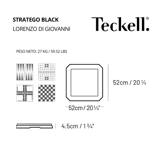 Ajedrez STRATEGO BLACK: estrategia, contemplación e inteligencia son elementos clave para disfrutar de los juegos de mesa de Teckell; pero, sobre todo, se necesita tiempo: un regalo inusual en esta era agitada. Un tablero y tres capas de maravilla: una base en mármol negro Marquina y un tablero de juego metálico delgado, protegido por una superficie de vidrio templado de bajo contenido en hierro.