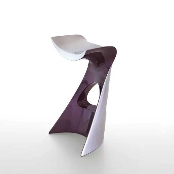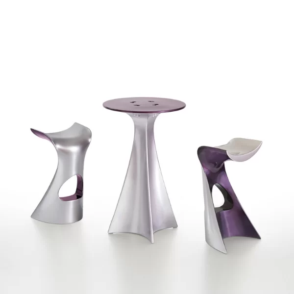 Gracias a un acabado especial cromado y lacado metálico, disponible en dos colores, gris y púrpura, KONCORD NEXT enfatiza con mayor fuerza las líneas dinámicas de su silueta. Su carácter futurista y su diseño aerodinámico lo convierten en el complemento ideal de la mesa alta JET NEXT.