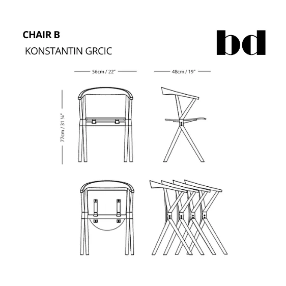 Silla plegable modelo B CHAIR, con respaldo elaborado en tres partes de madera maciza de fresno, laterales en madera contrachapada de haya, asiento con cara superior en fresno y cara inferior en haya, estructura inferior en tubo acero y fundición de aluminio pintado en blanco o negro, patas en forma de equis con asiento abatible para un apilamiento horizontal, disponible también en versión tapizada.