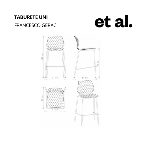 Taburete de polipropileno disponible en varios colores, con una amplia gama de marcos de acero, madera y aluminio. UNI destaca por su eficaz textura de efecto acolchado en la parte delantera y acabado brillante en la espalda. Consultar disponibilidad de acabados para exterior.